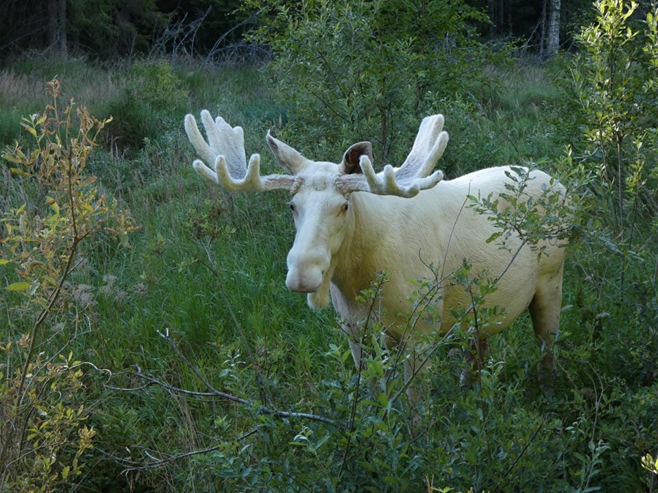 Wahre Albino-Elche sind extrem seltene Naturphänomene, bei denen ein Gendefekt die Produktion von Melanin vollständig verhindert. Oft werden sie jedoch mit leuzistischen Elchen verwechselt, die zwar weißes Fell, aber dunkle Augen besitzen.